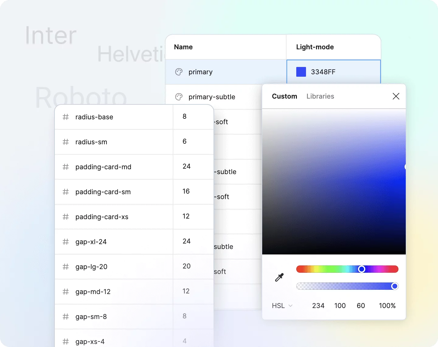Create by dragging and dropping from a library. Change color mode, variables, styles and typography